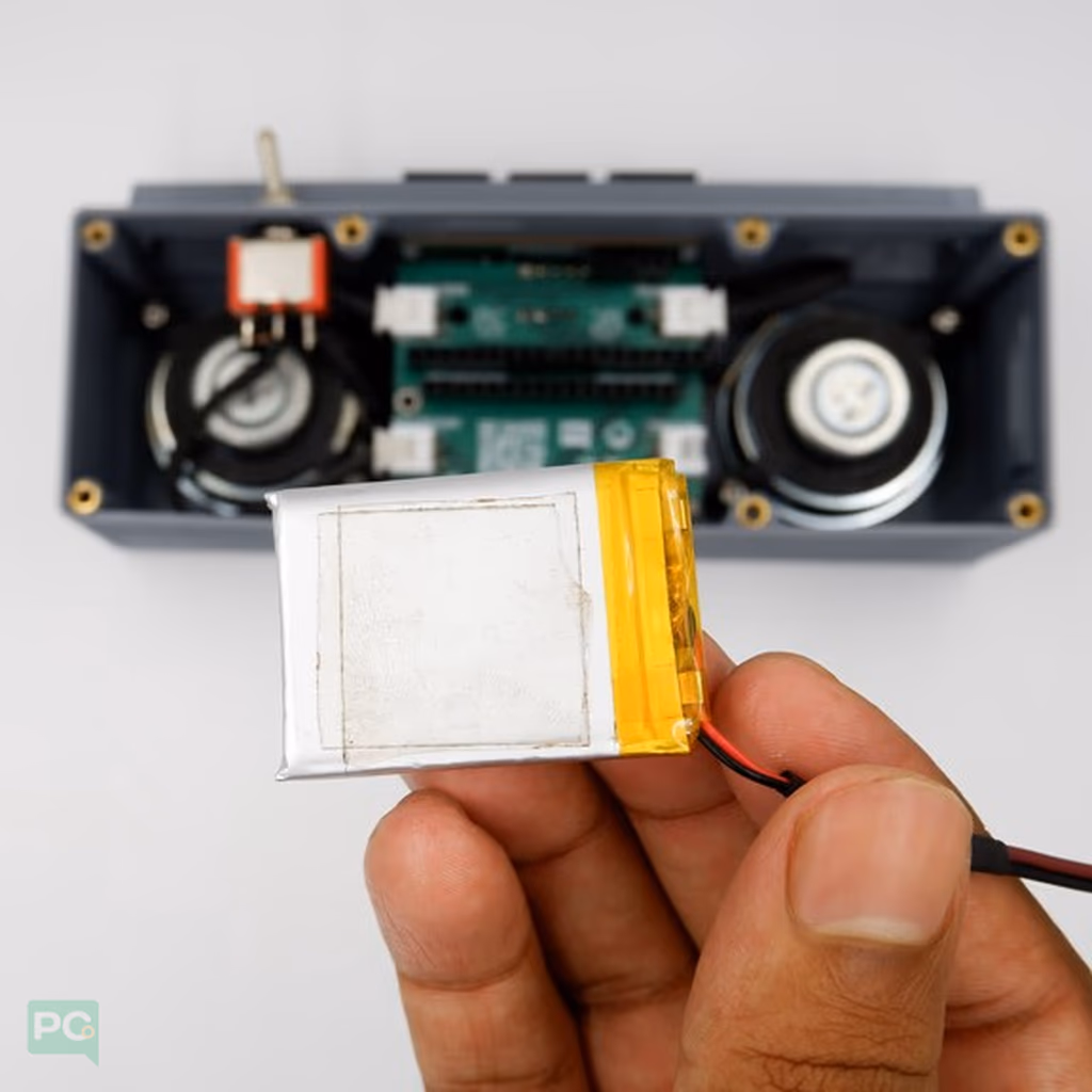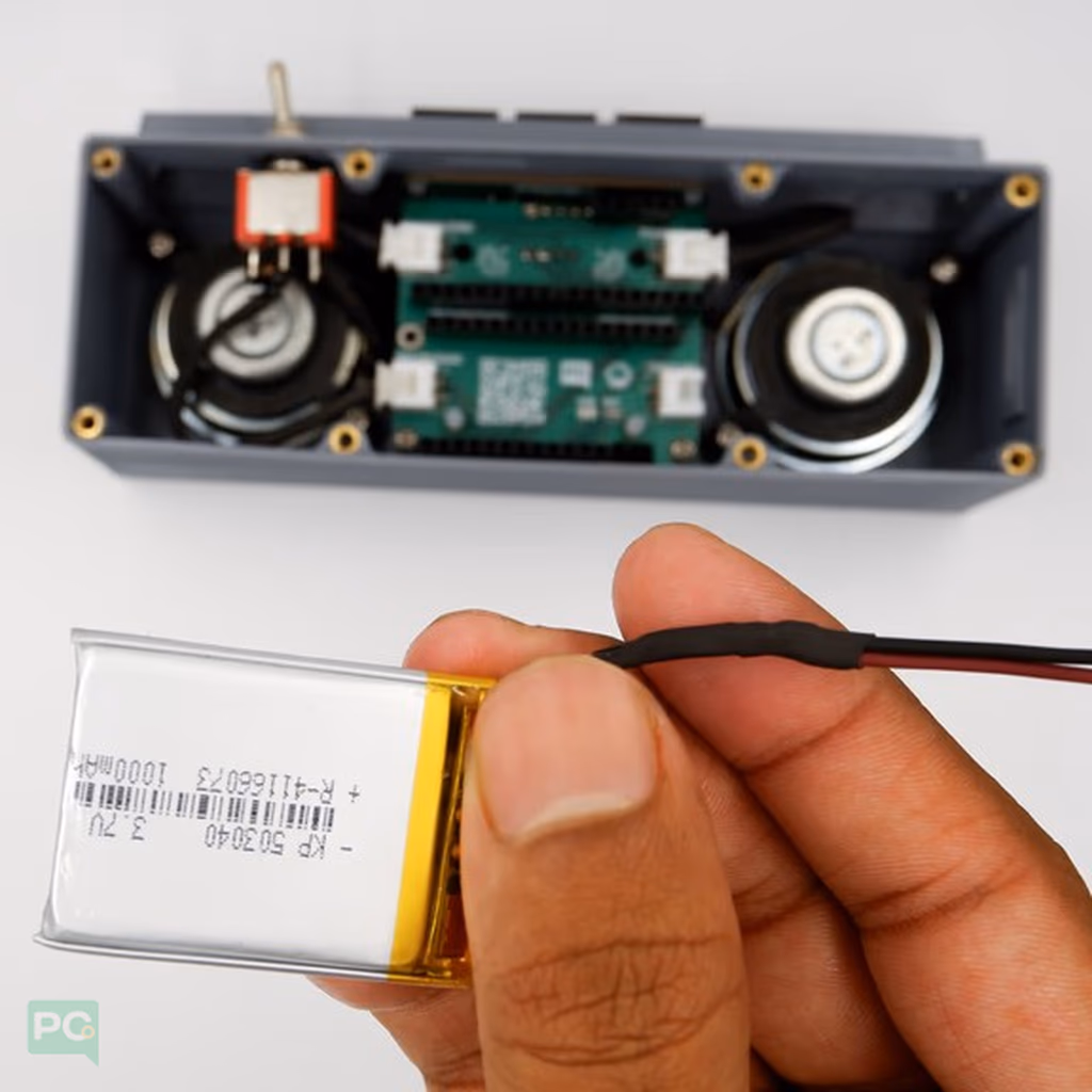 The battery is carefully selected based on required voltage, capacity, and size to ensure the Soundbox operates efficiently and fits properly within the case.